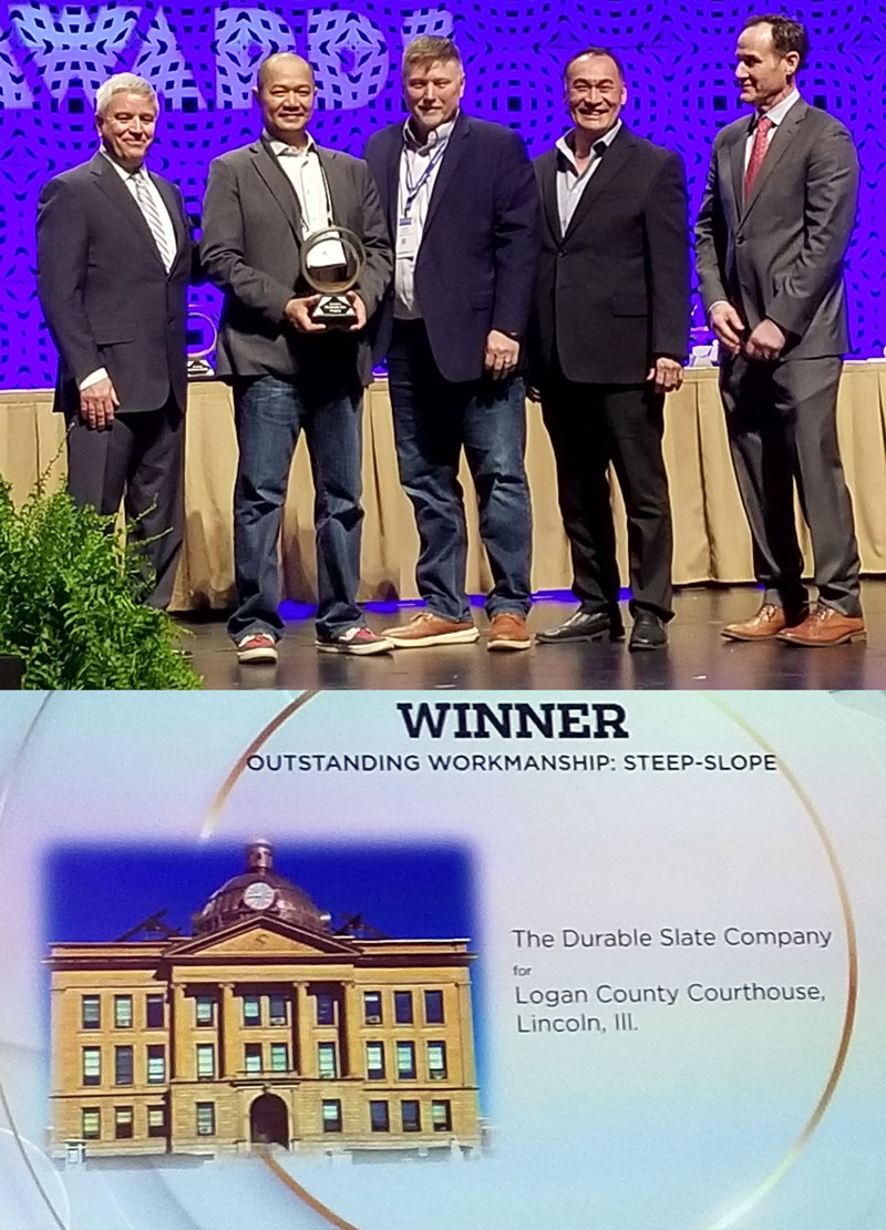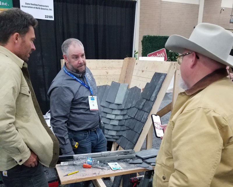 Orion Jenkins (Jenkins Slate Masters) and Korby Grist (Grist Slate and Copper Roofing, Inc.) demonstrate slating a valley.